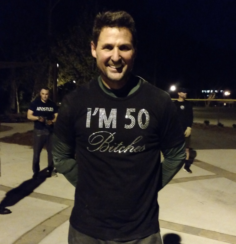 With a 50th b-day Q looming on the calendar, YHC schemed with the PAX to craft a special plan for Slim that he wouldn’t soon forget. While waiting at the flag for a slow trickle of PAX flowing in, YHC could tell he was a little disappointed that there wasn’t a larger showing of support. With the clock hitting T-5, it was time to cheer him up a bit and break out the WO attire of the day: