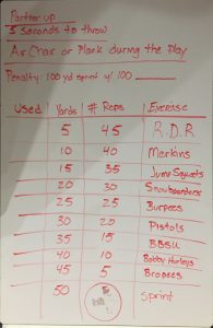 Pretty good start with some conservative pass/completions by the pax as we ease into part 2. D’oh – that first incompletion was not received well by the pax. Line up on the goal line and sprint 100 and then perform 100. Four incompletions led to 100 squats, 100 Raise da Roofs, 100 SSH, 100 LBC’s. You can thank Dory for your current leg dysfunction.