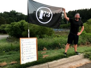 After the warmup, the Pax moseyed back down the hill to the parking lot to the left of the Rec Center. It was there where we saw Scar’s F3 flag posted with a large whiteboard leaning against it. On the whiteboard was the word “Gladiator” spelled out vertically with 9 exercises defining our beatdown.