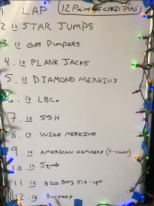 YHC had swung by the track earlier and setup the 12 pains of Christmas reference board.  It was quite simple, most AOs do this with increasing reps, but with Scrooge holding the keys (and an hour vs. 45 min)  it was going to be a little more painful.  So instead of the usual 12 days of Christmas pattern, we did 12 reps of every exercise and finished with a lap – all while listening to some choice Christmas music to keep everyone in the spirit.  Here’s the list: