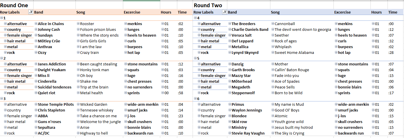 This am we had a musical chairs type of Q. QIC prepared 36 songs at 1-1:30 min in lengh of multiple Genres. Each Genre has a separate type of workout assigned. No break between songs and as many reps as possible on each.