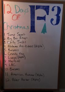 It wouldn’t be an F3 Christmas without the staple 12 Days of Christmas Routine.  Here’s a pic of what we did.  Tried to go with a spontaneous Rob Halford Christmas playlist that fell flat so we audibled to the classics that never disappoint on the cheer-o-meter.