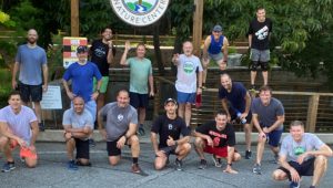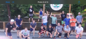 Time to mosey, back through the woods and over to “The Hill”. for an abbreviated Jacob’s Ladder (only to 5), but on the way up two sets of X5 HRMs (Hand-Release Merkins) with increasing Burpees at the top.