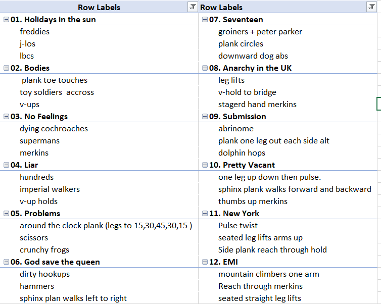 Each song at 3 Core excercies dedicated to it.