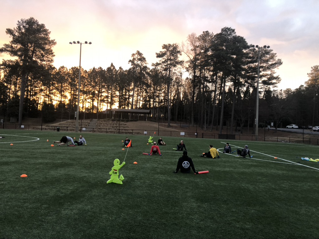 GAME SETUP & RULES: Each PAX gets a pool noodle (cut in half) color coded to their team’s color. The field is wide and fairly short, with a half field line of cones and a set of cones making an arc around each side’s flag, sort of like a penalty box in soccer. On your side of the field, you are in defense mode and have to be in a crabwalk position the entire time. On the opponents side, you are in offense mode, staying in bear crawl on that side. The goal is to hit the flag (which consisted of a “slow for children” sign with flag attached) which scores 1 point. If a team scores, everyone goes back to their side, the opponent must do 5 burpees and the team that scored does SSH until the other team is done. If you are tagged by an opponents pool noodle on the offensive side, you stand up and do 5 squats, then run back to your side. When you are on your side in defense mode you cannot be tagged, rather you are looking to tag out their offensive players. The key to this setup is that the bear crawl is slightly faster than the crabwalk which gives the offense a better chance to score leading to a higher point total. We used a 90’s rock playlist to jam to.