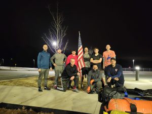 We gathered around the flagpole for one last exercise that was a doozy. We changed the tunes for one last song by AC/DC – a classic known as “Thunderstruck”. For this exercise we held a plank while the song played, and each time we heard the word “Thunder”, we did a merkin. The song seemed like an extended version, with more “Thunders” than we all remembered, and everyone was spent by the time the song ended. But we ended strong!