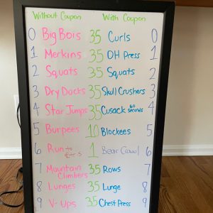 YHC instructed the PAX to pull a ticket out of the bag and match the last number of the ticket to the board.  If the ticket had the word ‘TICKET’ on it they were to use the right side of the board which involved coupon work using the rep counts down the middle.  If they drew a ticket without the word ‘TICKET’ on it they were to use the left side of the board (without coupons).  Of course, I didn’t notice until this morning that the other ticket actually had the word COUPON on it which undoubtedly caused some confusion with the PAX.  It only took us 10-12 rounds to totally figure it out.  Some PAX drew a nice variety of exercises while I heard at least one PAX drew blockees 3x.  Fun was had by all although the playlist received some much-deserved scrutiny.