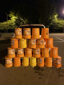 With the bucket upside down, perform 1 merkin. While in the plank position, tap the top of the bucket.