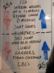 25 count (alpha where appropriate) and the blue team starts at the bottom, red at the top. After each exercise we ran to the far hashmark and back. If below the burpee line, you run backwards. If above, you run forward.