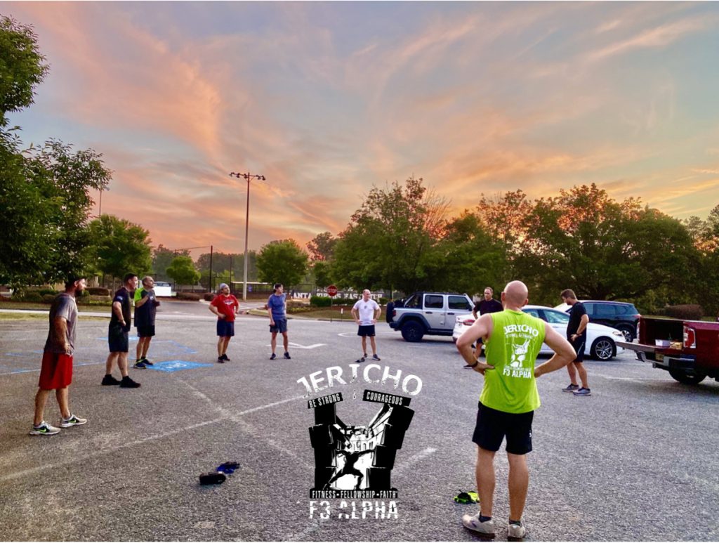 Long mosey 0.63 miles around, through, and over the football field. Come back and circle up in tennis courts for typical SSH, Good mornings, etc.