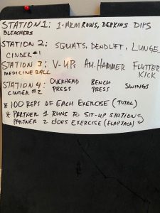 Pax partner up, perform 100 total reps of each exercise at each station. Partner 1 does exercise while partner 2 runs. Flap Jack. Pax keep going until current song is over and new song begins. When new song starts, rotate to next station.