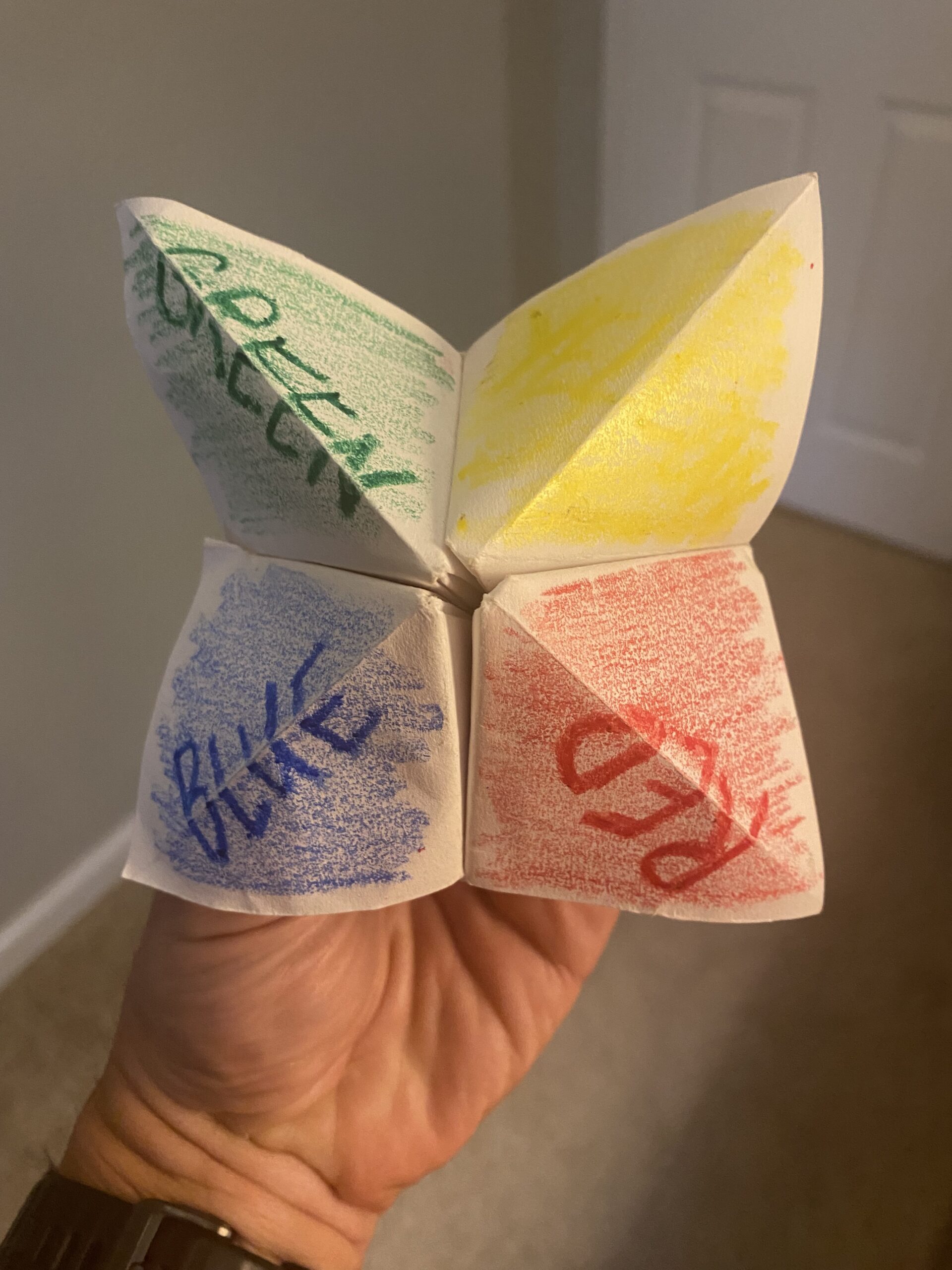 Also, ICYMI, a paper fortune teller is also lesser known as a cootie catcher, chatterbox, whirlybird, salt cellar, or paku-paku. Also a w** p**** in some less sophisticated circles…