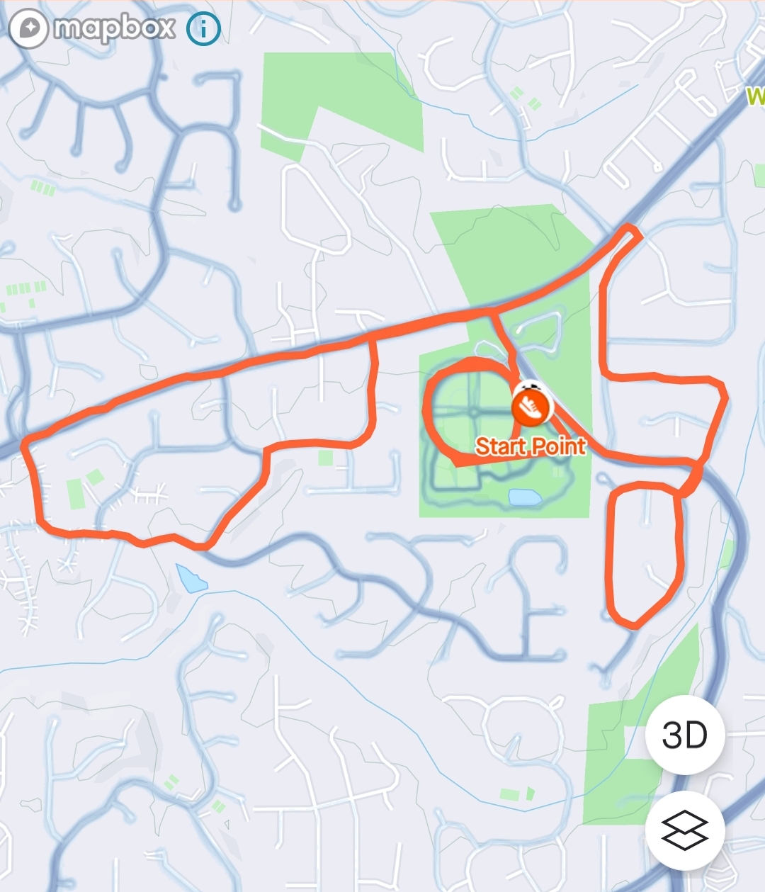 This was meant to be a tour so we hit the walking trail through the woods which dumped us back onto the track around the ball fields. Completing that loop we were back to the parking lot and hit the road south to the traffic circle. Took a right and completed a loop returning to the traffic circle again and proceeding straight across to see more of the Pinewalk neighborhood. Heading east we hooked back up with Kimball Bridge and took a left, passing the park again on the way to Tuxford. Left into Tuxford (Kimball Oaks entrance), then right, then left, then a right… basically we went down a bunch of hills and then ran back up them a different way and out of neighborhood. A right on Kimball Bridge and a right back into the park, one more lap around the ball fields and we are hitting the 5-mile mark. We’ll keep doing different routes until folks are more familiar with the options, of which there are many.