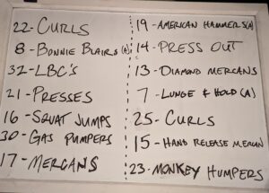 We got through Presses (almost losing it at the second exercise!) the first time when someone was unsure of what was next and we made our 2nd trip. Pax quickly organized to help remember the list and subtly help the group but were stuck again at American Hammers. A little more team work and we got through the board. One last trip to check our work and bring it back. Great work from the group and catching themselves with some almost questions….
