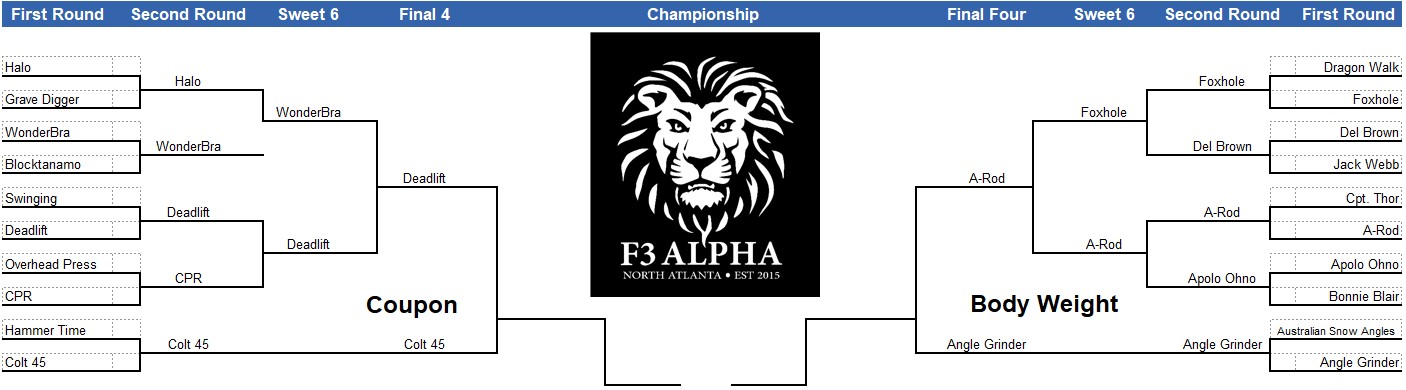 After the first weekend of the annual College Basketball Playoffs. Except we are going to do it in 45 minutes pitting a coupon bracket against a body weight bracket. The invited exercises were culled from the F3 Nation Exicon and were picked because of their obscurity to the F3 Alpha community.