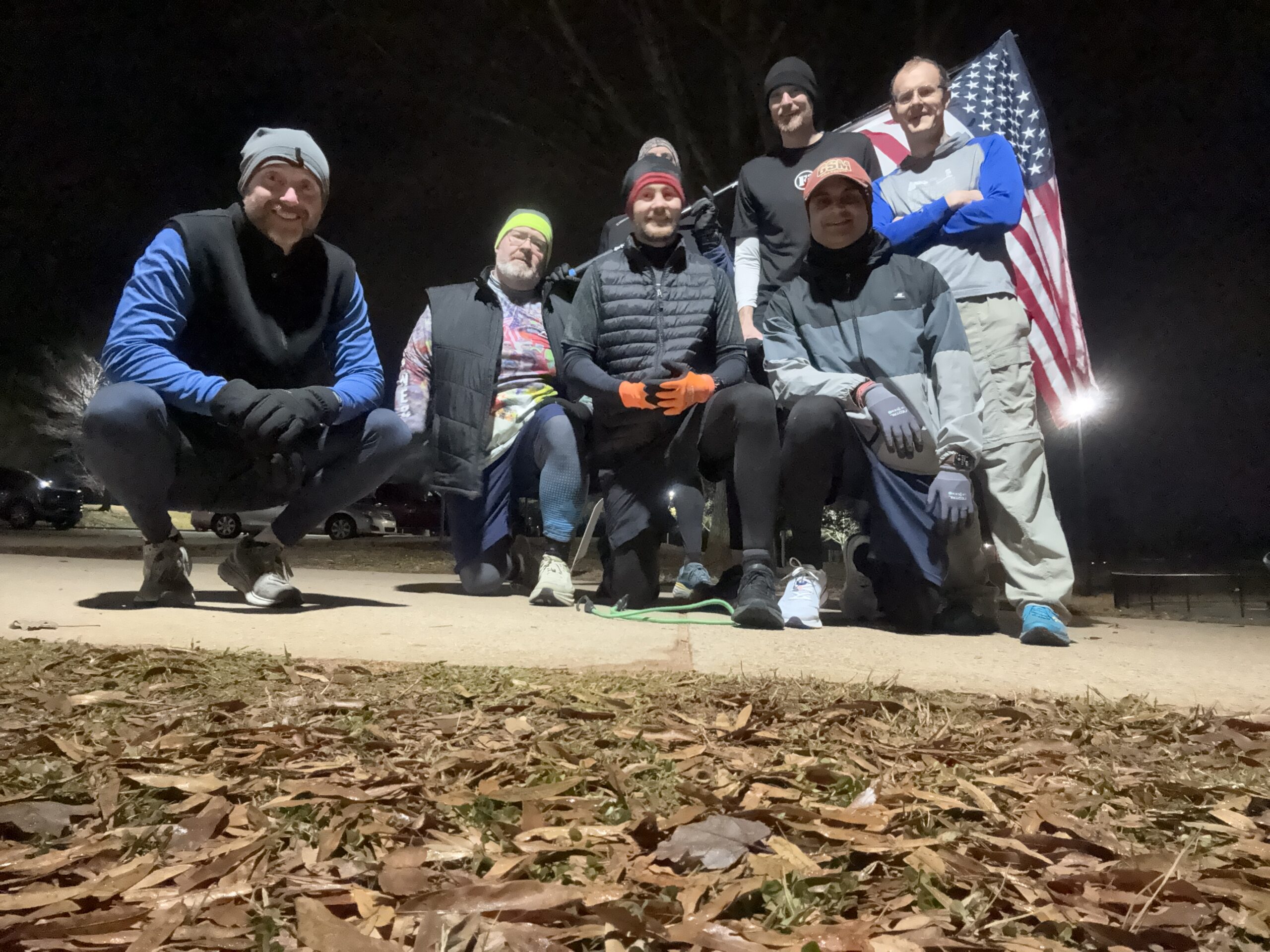 There were a couple of different formats to play this that I shuffled through my head, but we started with having one team going first and the other team waiting to "steal." If the team could answer both the artist and the title then they would perform 5 reps of an exercise and the losing team would perform 25 reps. If they could answer one of either the artist or title, then the other team had a chance to complete the answer. If both teams give one answer, then both perform 10 reps. If no answer is given, then both teams perform 20 reps. Songs would play a 4 second clip and teams would then have 5 seconds to answer. Teams were Mr. Hand, Ditch Witch, and Schneider VS Schrute, Seaman, and Geek Squad (with YHC playing host). After a couple of rounds, this quickly became the Mr. Hand/Seaman show (insert pun here). So we pivoted the format to one player from a team answering and if they had to get help from their teammates, that would incur a 5 rep penalty. Opposing teams also came up with the exercise before the song was played. YHC always performed the losing amount of reps (so fun!). After 10 rounds, we had a halftime gRUNge run! PAX ran a loop around the 1st and 2nd levels of the parking lot back to the speaker. Time ran out before we could finish the 20 rounds, but it turned out to be a competitive game (between Mr. Hand and Seaman). PAX moseyed back to the flag for COT.
